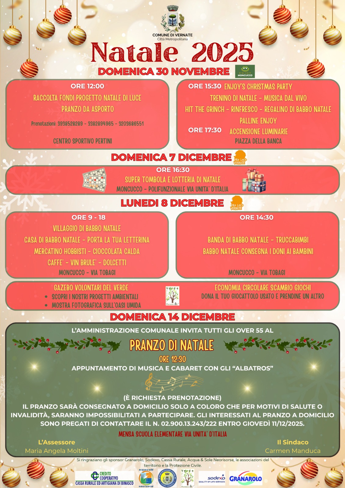 E infine l’evento più importante per tutta la comunità, il Pranzo di Natale tutti insieme, dalle ore 12.30 di domenica 14 dicembre presso la mensa della scuola primaria: l’Amministrazione invita tutti gli over 55 con musica e cabaret con gli Albatros.