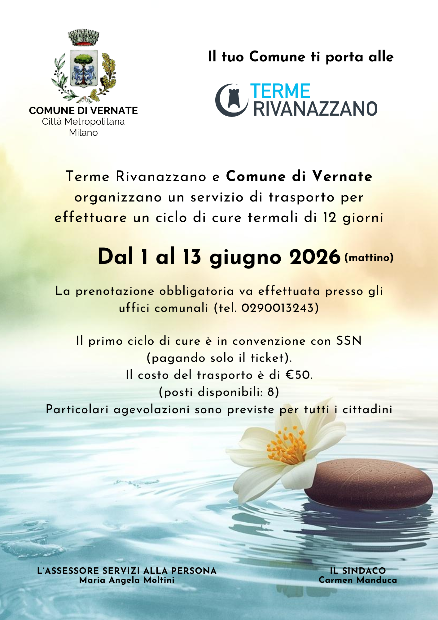 Vernate (25 marzo 2026) - Terme di Rivanazzano e Comune di Vernate organizzano un servizio di trasporto per effettuare un ciclo di cure termali di 12 giorni, in programma dal 1° al 13 giugno 2026.