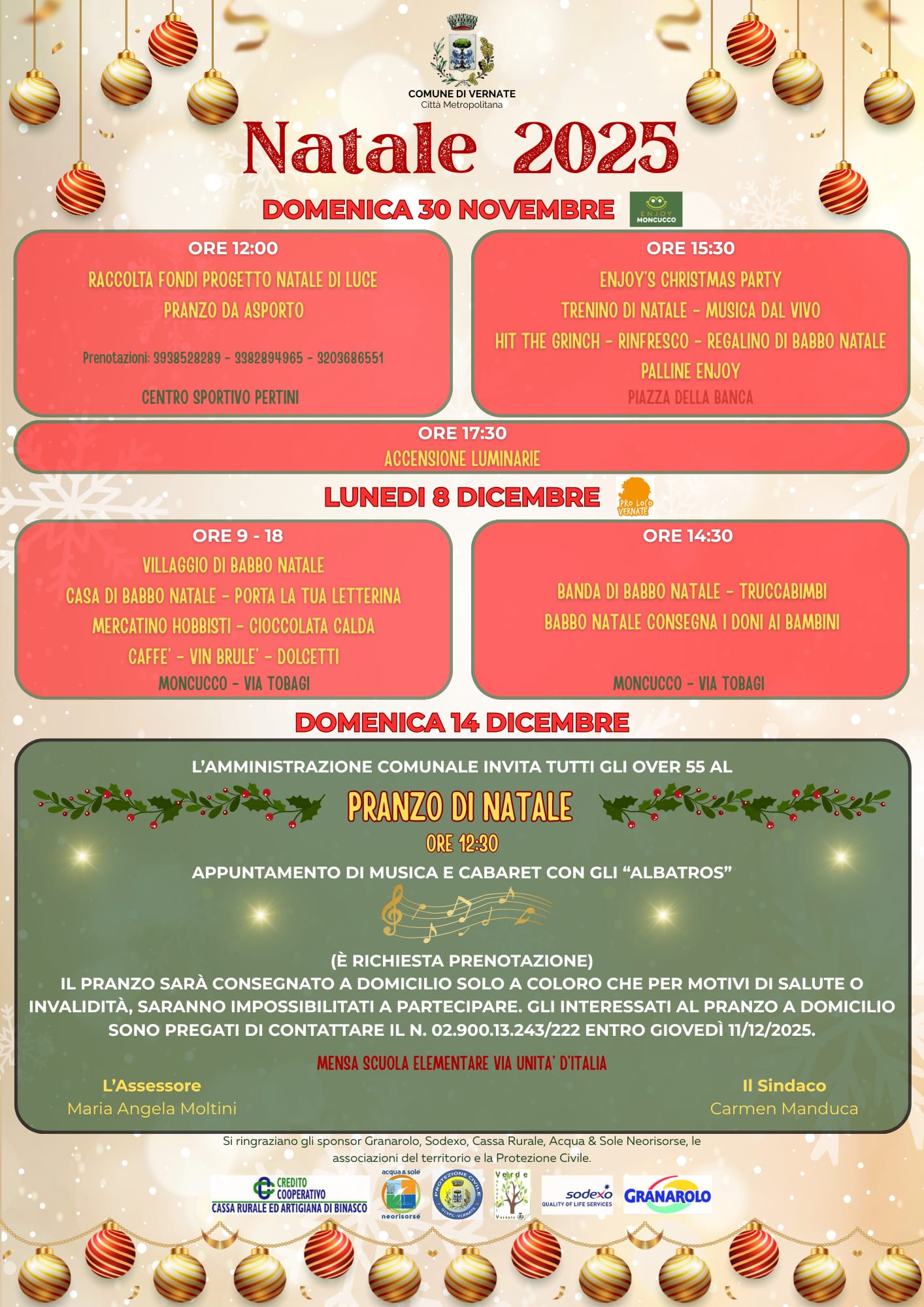 Vernate (24 novembre 2025) – Occasioni per vivere insieme la magia del Natale, tra iniziative di solidarietà, economia circolare, musica e Babbo Natale.