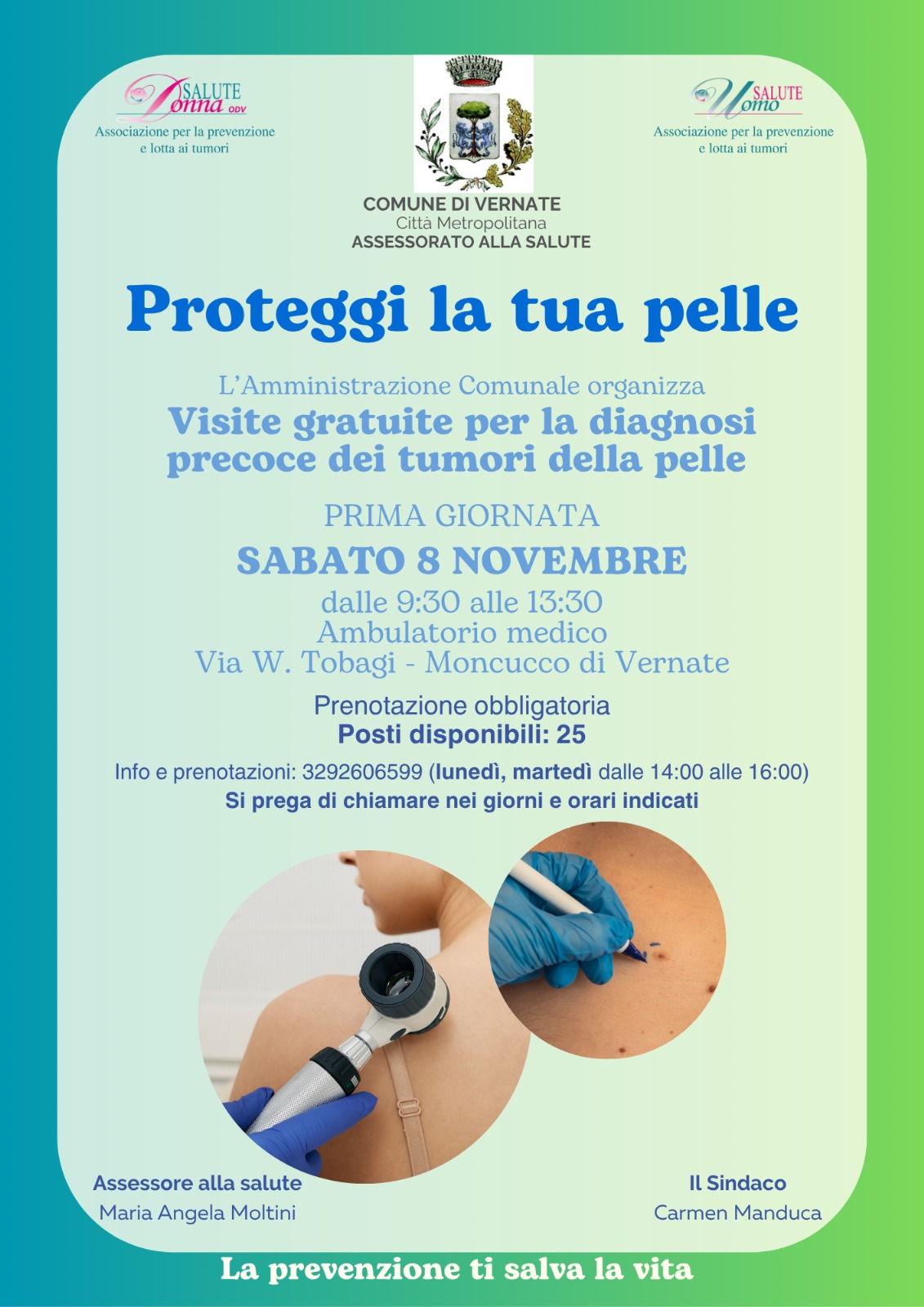 Vernate (31 ottobre 2025) – L’Amministrazione comunale di Vernate (assessorato alla Salute) organizza visite gratuite per la diagnosi precoce di tumori della pelle, per promuovere la prevenzione.