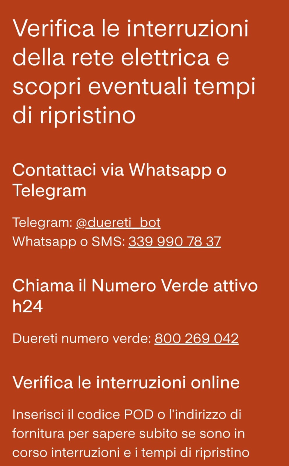 Vernate (10 novembre 2025) – Visti i ripetuti disservizi alla rete elettrica, comunichiamo i canali di comunicazione per inviare le segnalazioni al fornitore Duereti: