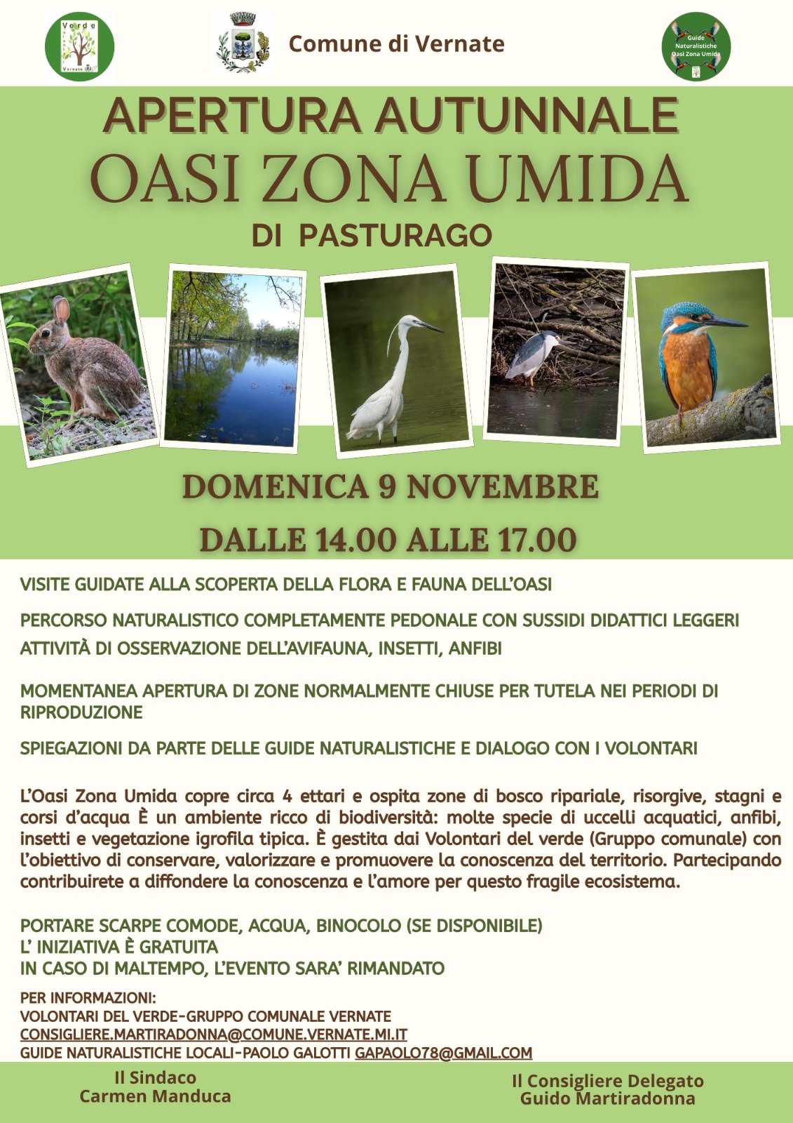 Vernate (21 ottobre 2025) - Domenica 9 novembre dalle 14 alle 17 è programmata l’apertura straordinaria al pubblico dell’Oasi Zona Umida di Pasturago, iniziativa organizzata dall’Amministrazione comunale con i Volontari del Verde e le Guide naturalistiche locali.