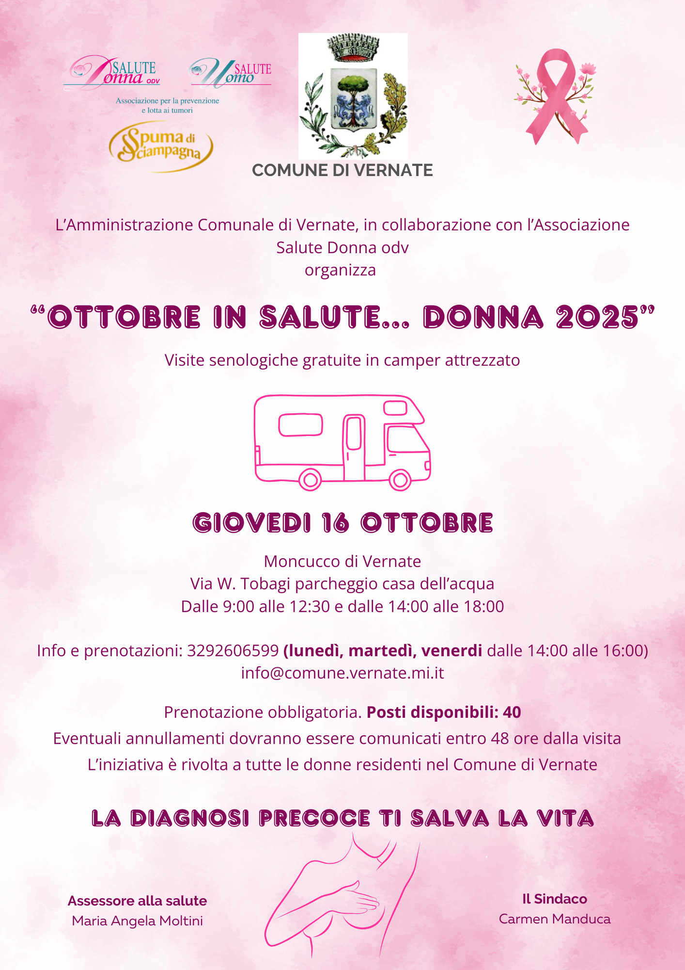Vernate (3 ottobre 2025) - L’Amministrazione comunale di Vernate, in collaborazione con l’Associazione Salute Donna odv, organizza “Ottobre in salute… donna 2025”, con visite senologiche gratuite in un camper attrezzato, programmate per il giorno 16 ottobre 2025 dalle 9 alle 12.30 e dalle 14 alle 18 in via Walter Tobagi frazione Moncucco) presso il parcheggio della Casa dell’Acqua.