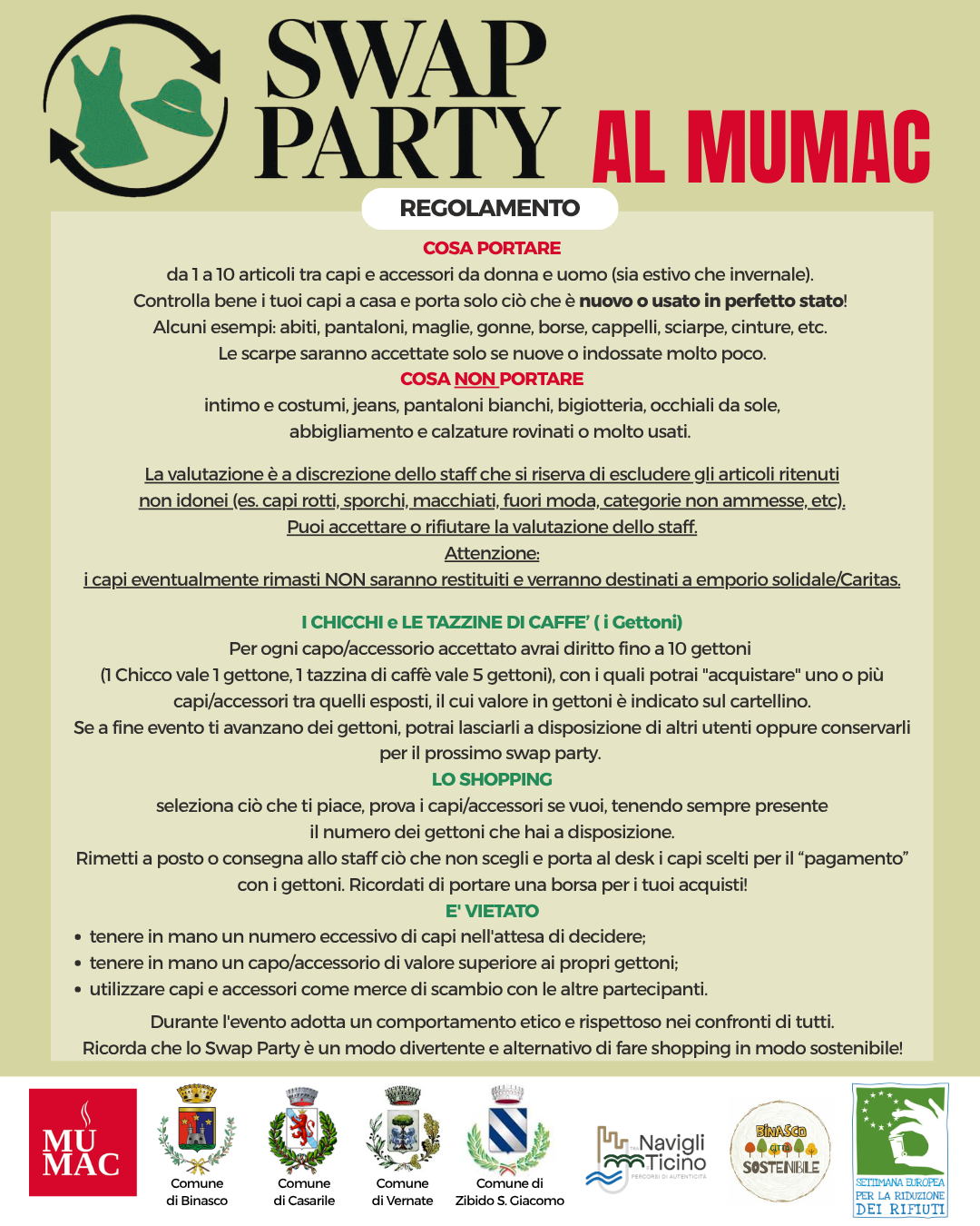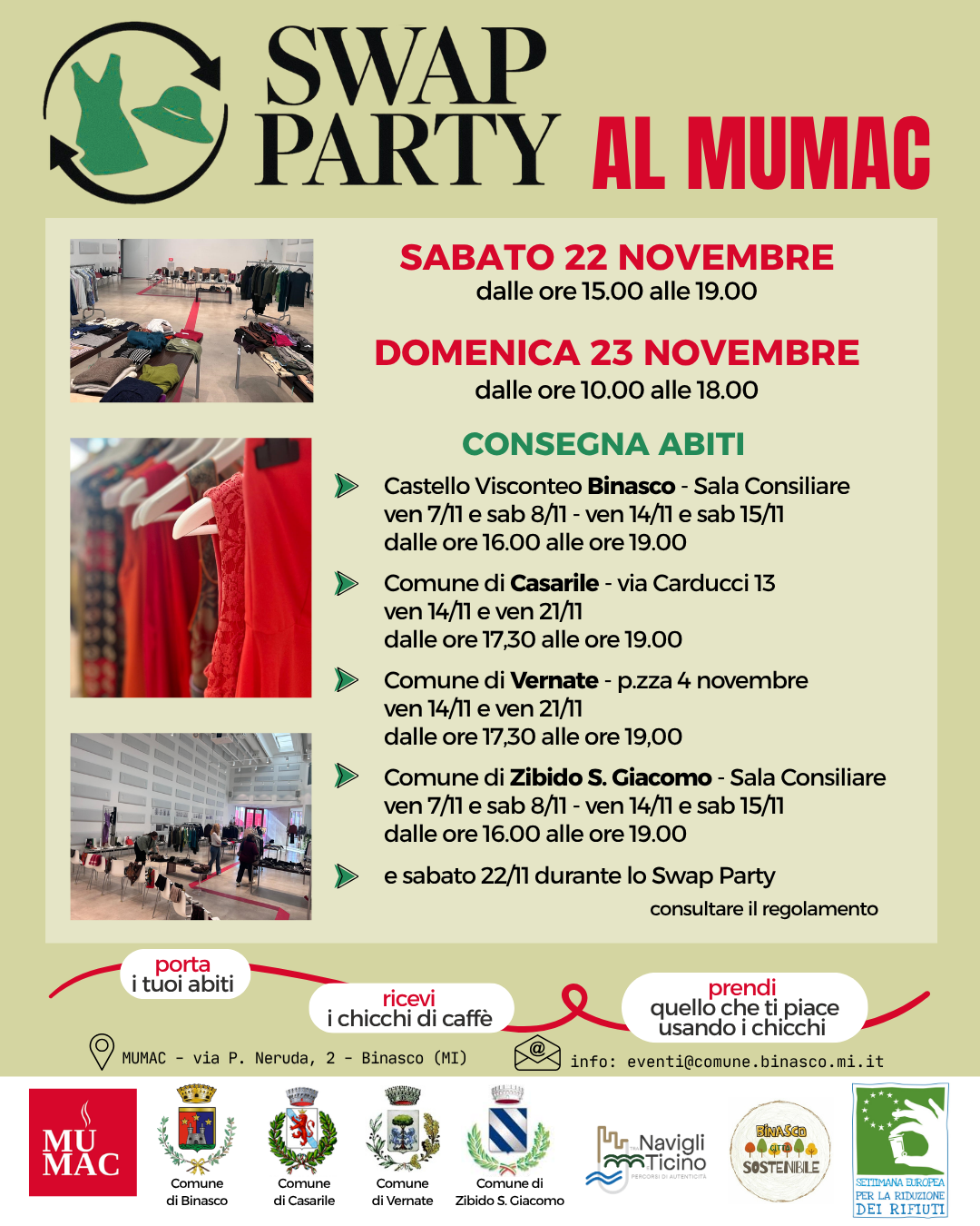 Vernate (7 novembre 2025) – In occasione della Settimana europea per la riduzione dei rifiuti, l’Amministrazione comunale di Vernate ha aderito insieme ai Comuni di Binasco, Casarile e Zibido San Giacomo alla manifestazione “Swap Party 2025” che si terrà sabato 22 novembre dalle 15 alle 19 e domenica 23 novembre dalle 10 alle 18 presso gli spazi del MUMAC – Gruppo Cimbali a Binasco.